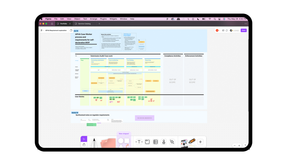 We kept it intentionally minimal. No polished UI, no fully working system. Just low-fidelity screens, rough end-to-end user journeys, and realistic scenarios that let us walk through the case worker experience and key regulator decisions. It was scrappy by design—but sharp enough to validate our thinking and surface gaps before they became expensive.